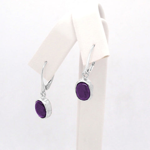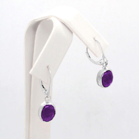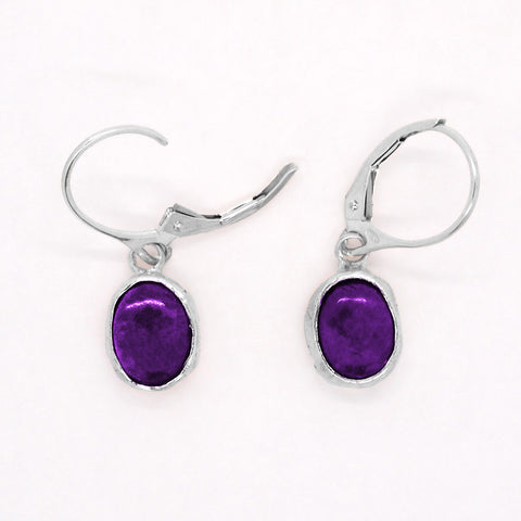* These Amethyst cabochon dangle earrings are set on a bezel with a safe lever back.
